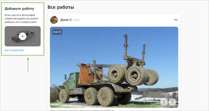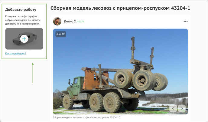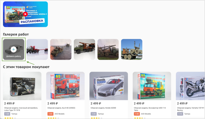 При добавлении фотографий собранных моделей на страницах товаров они автоматически привязываются к товарам. При добавлении работы через Личный кабинет либо через основную страницу Лавкаграм главного меню вы можете самостоятельно привязать её к конкретному товару магазина “Модельная Лавка”. Публикацию, привязанную к товару, увидит большее количество людей.
