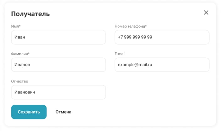 Заполните личные данные для службы доставки или Почты России. Введите