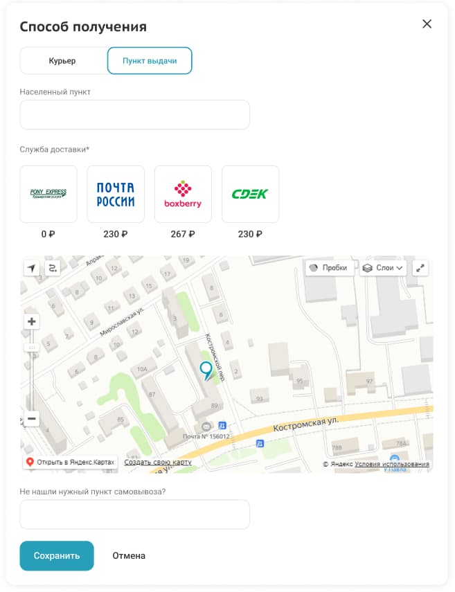 Для доставки необходимо указать точный адрес и выбрать службу.